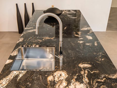 Im Gegensatz zur Epoche unserer Urgrossmütter, wo eine Stein-Küche fast immer dem regionalen Standard entsprach, verfügen wir heute beim Planen von Naturstein-Küchen über eine Vielzahl an Möglichkeiten, um die Gestaltung der Küche ganz spezifisch an die Wünsche und Bedürfnisse der Bauherren anzupassen. So lassen sich nicht nur Abdeckplatten, Bodenbeläge, Rückwände und selbst kleinere Nischen, sondern auch ganze Kücheninseln aus einem Guss problemlos mit Naturstein verkleiden. Und weil jede Natursteinsorte eine ganz spezifische Aura besitzt und je nach Oberflächenbehandlung bezüglich Optik und Haptik individuell verändert werden kann, lässt sich jede Naturstein-Küche völlig individuell gestalten. Dabei ist Granit aufgrund seiner hohen Robustheit bei Küchenabdeckungen und Arbeitsplatten besonders beliebt. Steht das Design-Kunstwerk aus Naturstein erst einmal als das perfekte emotionale Spiegelbild der Bauherrschaft, so ist ihm damit fast schon eine Art persönliches Denkmal errichtet, das die persönliche Wertehaltung reflektiert.